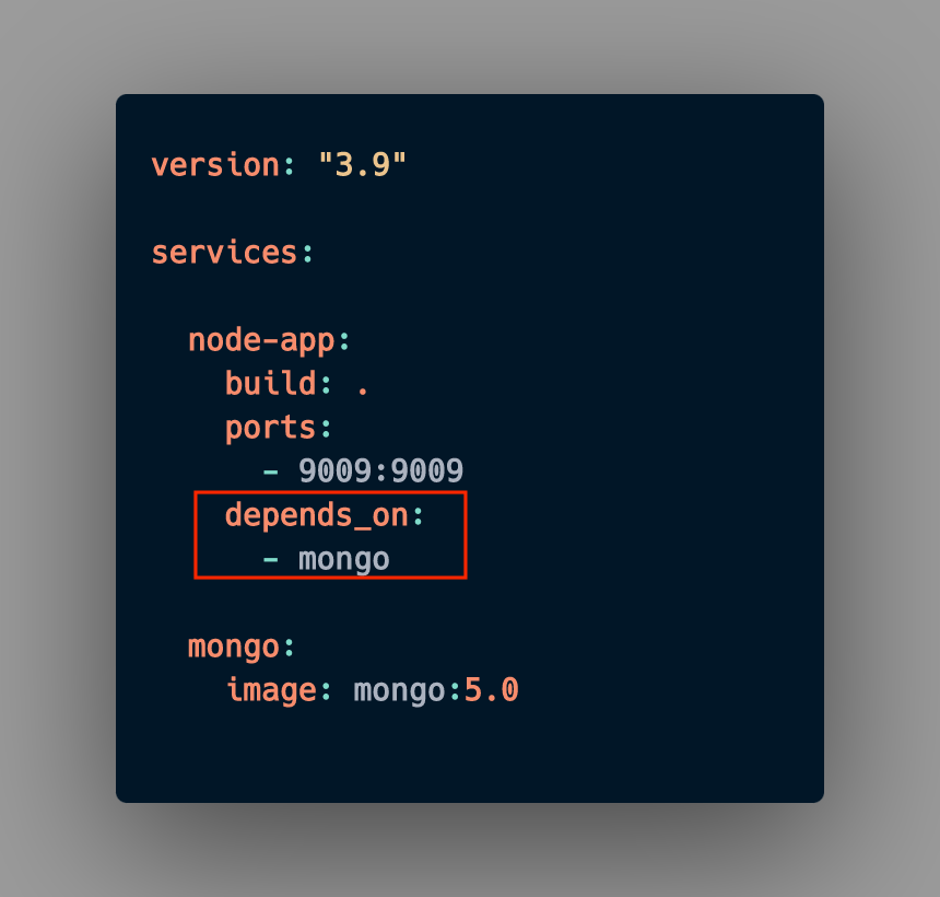 If a container depends on another container, and the latter needs to run first, use the "depends_on" property. This ensures that the Mongo container runs before the Node app container. NOTE: This does not guarantee that the container will start first, as it depends on various factors.