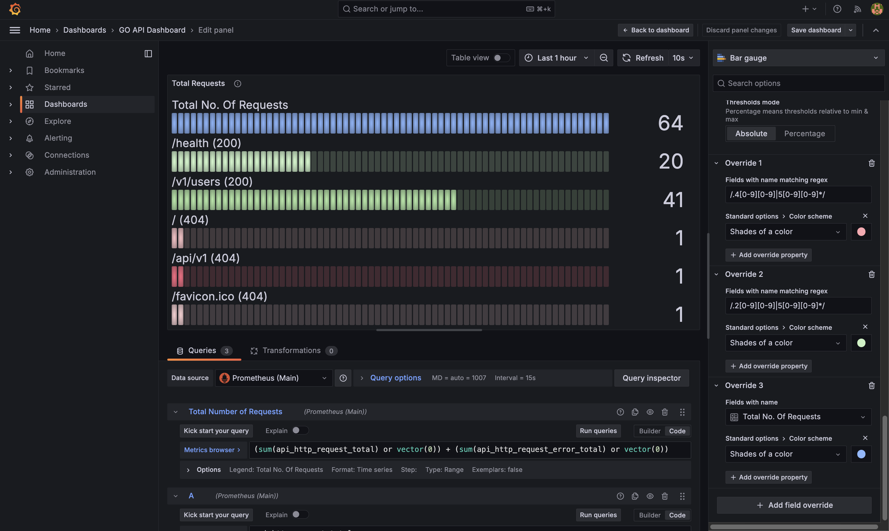 We created this panel to visualise the total number of requests from different endpoints to compare the successful and failed requests. For all the good requests, the bar will be green, and for all the failed requests, the bar will be red. Plus, it will also show from which endpoint the request is coming, whether it's a successful request or a failed request. If you want to get the dashboard JSON, you can visit this repo here. You will also find the complete code for the Golang application, Dockerfile and Docker Compose file we created in this blog.