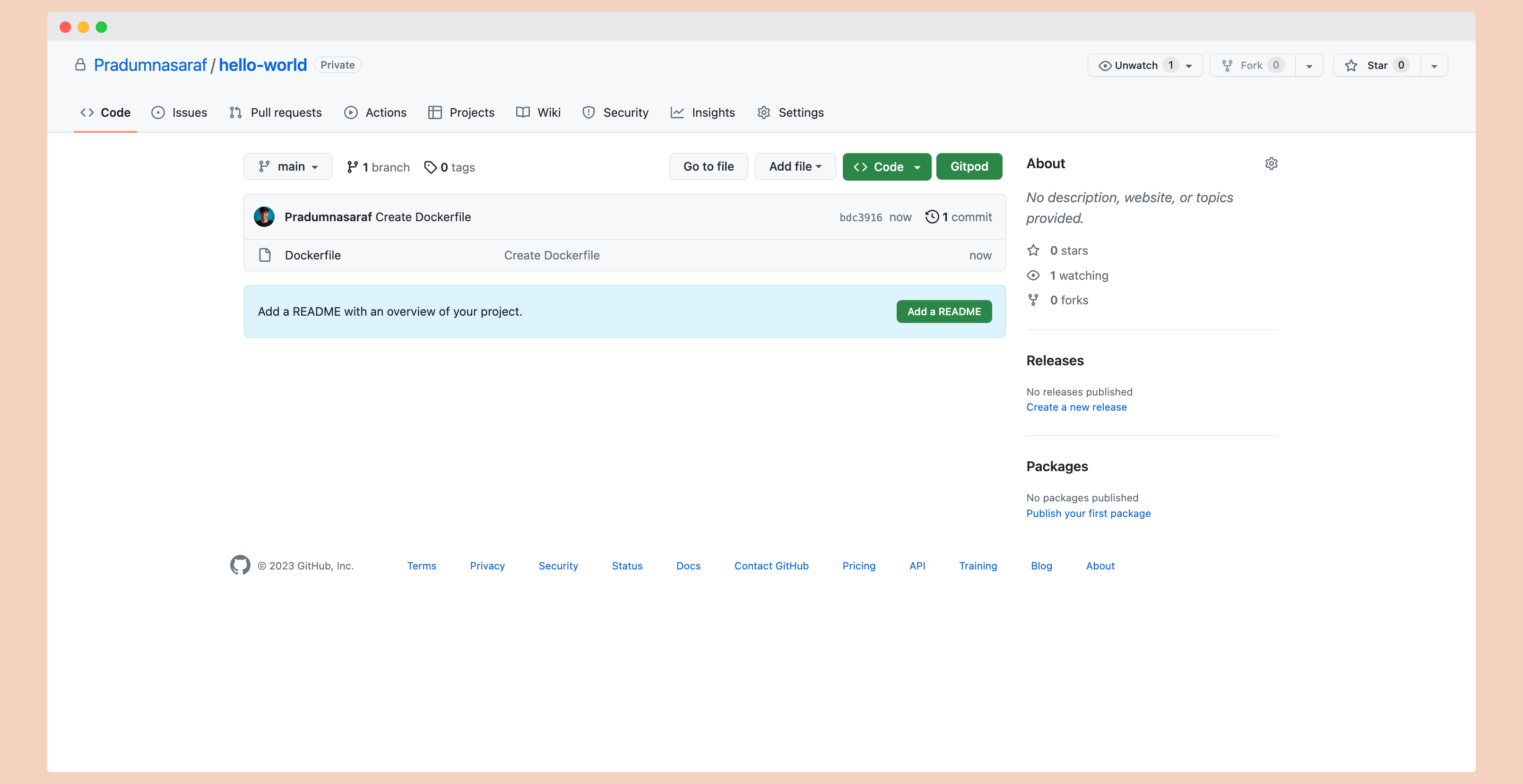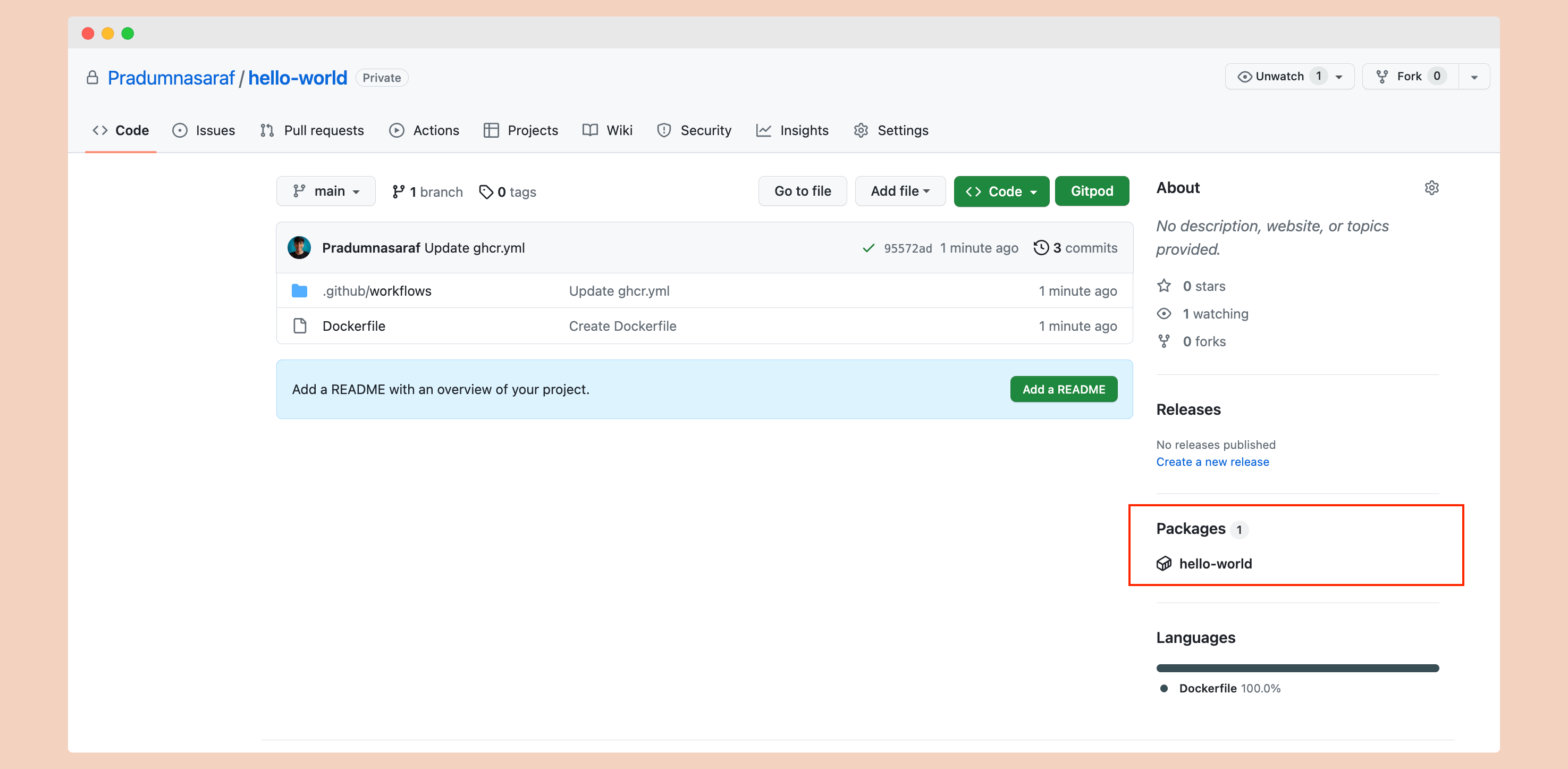 To check if the package has been released, navigate to the root of your GitHub repository. Under the Packages section, you should find a package named hello-world. This package indicates that the Docker image has been successfully built and published to the container registry.