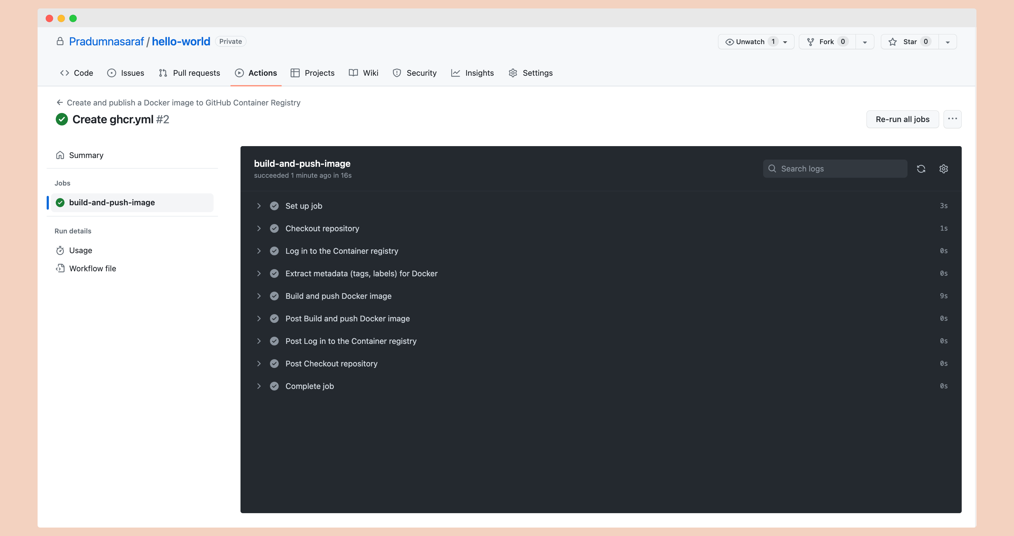 To check if the workflow is running, go to the "Actions" tab. In my case, the workflow ran so fast that it already completed all the steps to publish an image to GHCR and publish a package.