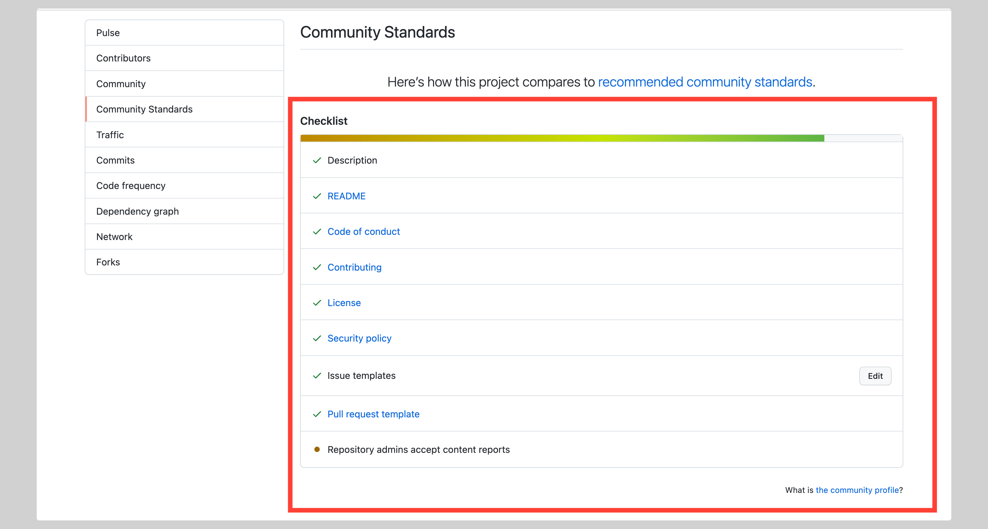 Setting up things like a LICENSE, a Code of Conduct, contributing guidelines, and other community standards in the Community Standards section of a repository is a great way to demonstrate and ensure that a project has clear guidelines for communication and promotes inclusivity. Additionally, setting up issue templates allows issue and bug reporters, as well as contributors, to provide a well-structured format for explaining issues. This can help save time for both the reporters and the developers, and ensure that issues are addressed effectively.
