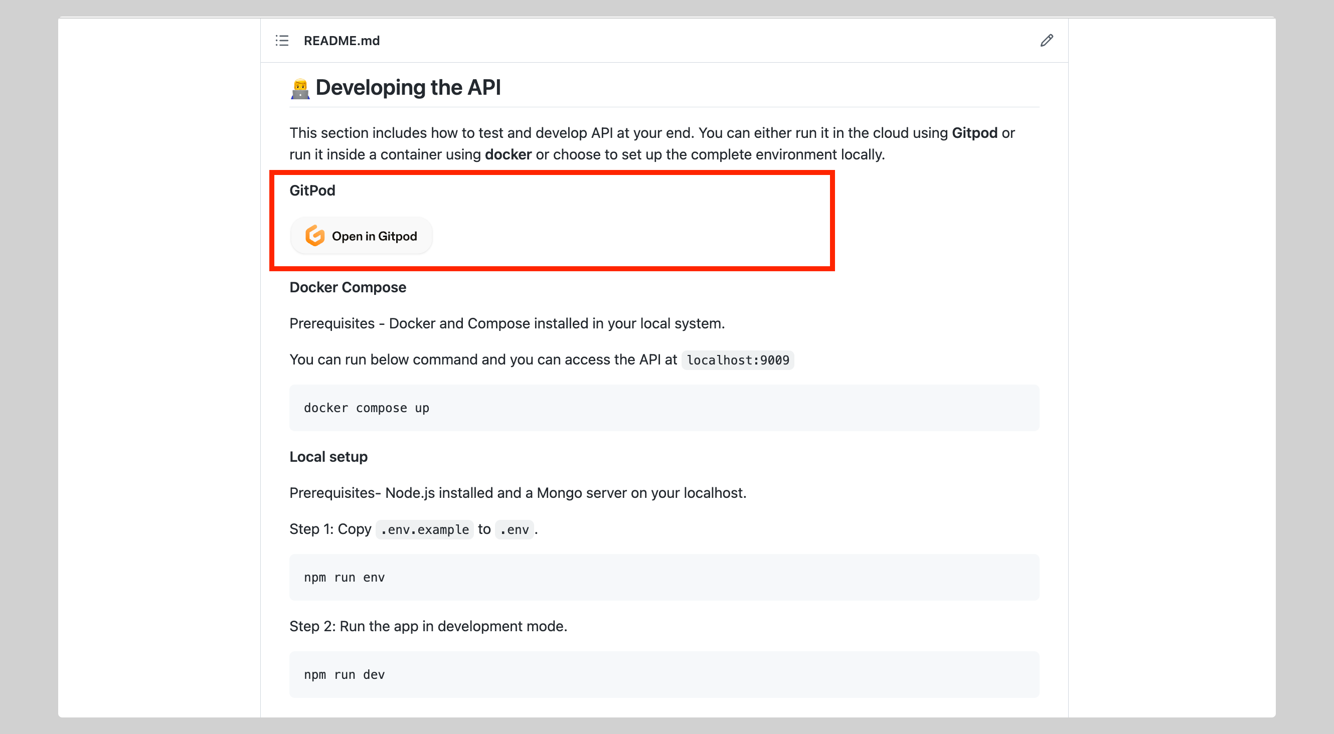 Setting up a local development environment can be a daunting task for new contributors and a significant barrier to entry for contributing to a project. Cloud development environments offer an excellent solution to make your project more accessible to contributors, as they enable contributors to work on your project without needing to install any dependencies. Popular cloud development environments include Gitpod and GitHub Codespaces. Additionally, we can make it easier for contributors to access our project in Gitpod by adding a button to our README file.